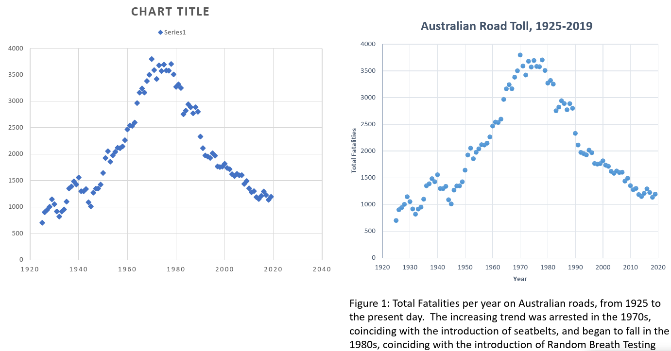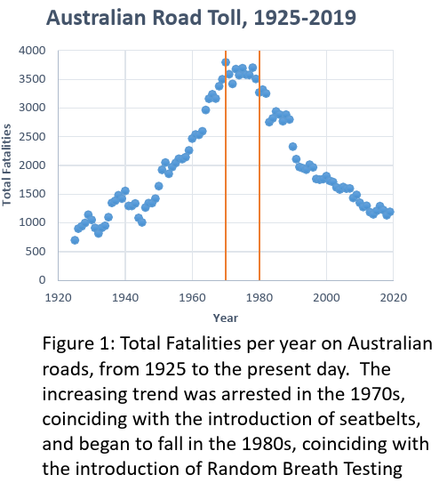 In Figure 1, the variation of total fatalities per year on Australian roads is shown over the past century. The upward trend in fatalities from 1925 up to 1970 stalls around 1970, which is the year that legislation to make seatbelts compulsory begin to be enacted in Australian states. Furthermore a downward trend beginning in the 1980s is observed in the data, coinciding with a period when various other safety measures were introduced, such as random breath testing (RBT). |