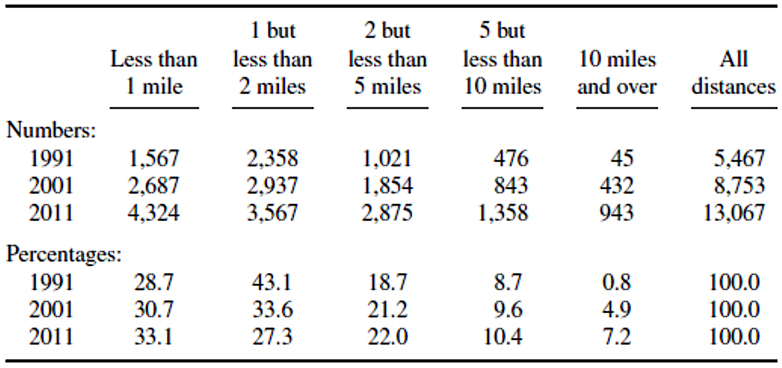 | Table 2.9 Example of percentage data interfering in message. | Table 2.10 Distance of travel to work by car. |